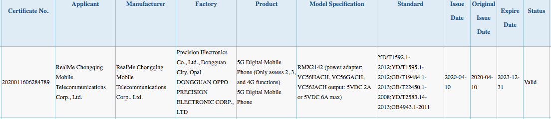 Smartphone tersebut mengusung model number Realme RMX2142 dan di-duga kuat sebagai vanilla Realme X3. Listings yang diberikan TENAA juga memperlihatkan sedikit info menyangkut spesifikasi smartpohne tersebut.