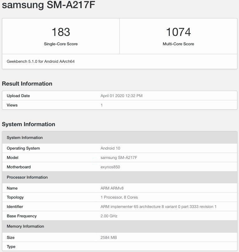 SM-A217F terlihat menggunakan Samsung Exynos 850, dan untuk yang belum tahu, chipset tersebut belum dirilis. Smartphone tersebut juga menggunakan RAM yang memiliki kapasitas 2584MB (2.5GB).