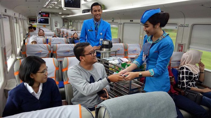 Pramugari cantik dan pramugara gagah juga siap melayani kebutuhan penumpang dalam kereta, mulai dari makanan, minuman, selimut hingga bantal.