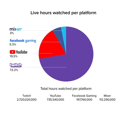 Dari semua platform, Twitch membukukan catatan yang paling mentereng di mana mereka mendapatkan 2,72 miliar jam tonton atau sekitar 72,2 persen. Di bawah Twitch ada nama YouTube dengan 735,54 juta jam (19,5%), Facebook dengan 197,76 juta jam (5,3%), dan Mixer dengan 112,29 juta jam (3%).