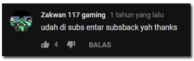 Komentar yang seperti ini, beberapa tahun lalu cukup mudah ditemukan di beberapa channel YouTube. Namun kini, komentar tersebut mulai menyusut, setelah subsback terbukti tidak efektif mendatangkan subscribers.