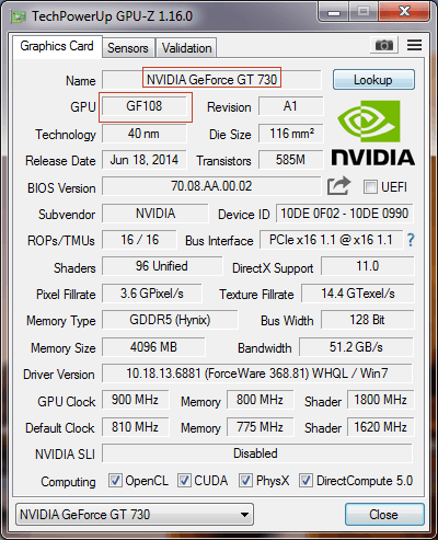 Lihat pada kolom GPU dan Googling kode tersebut maka akan terbongkar semuanya.