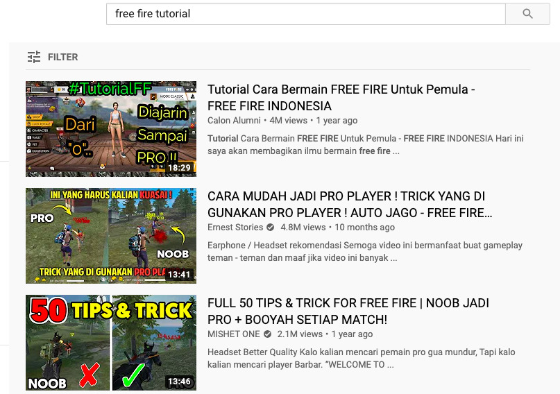 Kamu bisa gunakan pencarian di YouTube untuk mencari berbagai trik-trik FF, review skin ataupun senjata, dan berbagai ilmu bermanfaat lainnya.