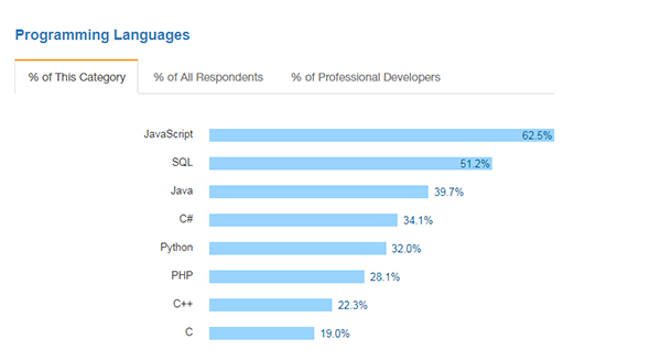 Berikut ini adalah hasil survei Stack Overflow (situs tanya jawab seputar pemrograman) mengenai bahasa pemrograman yang paling umum digunakan.