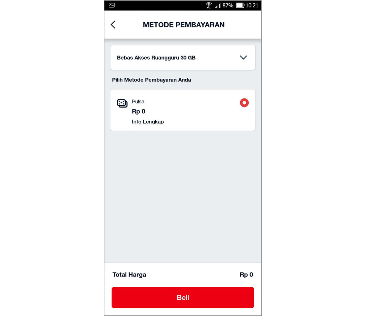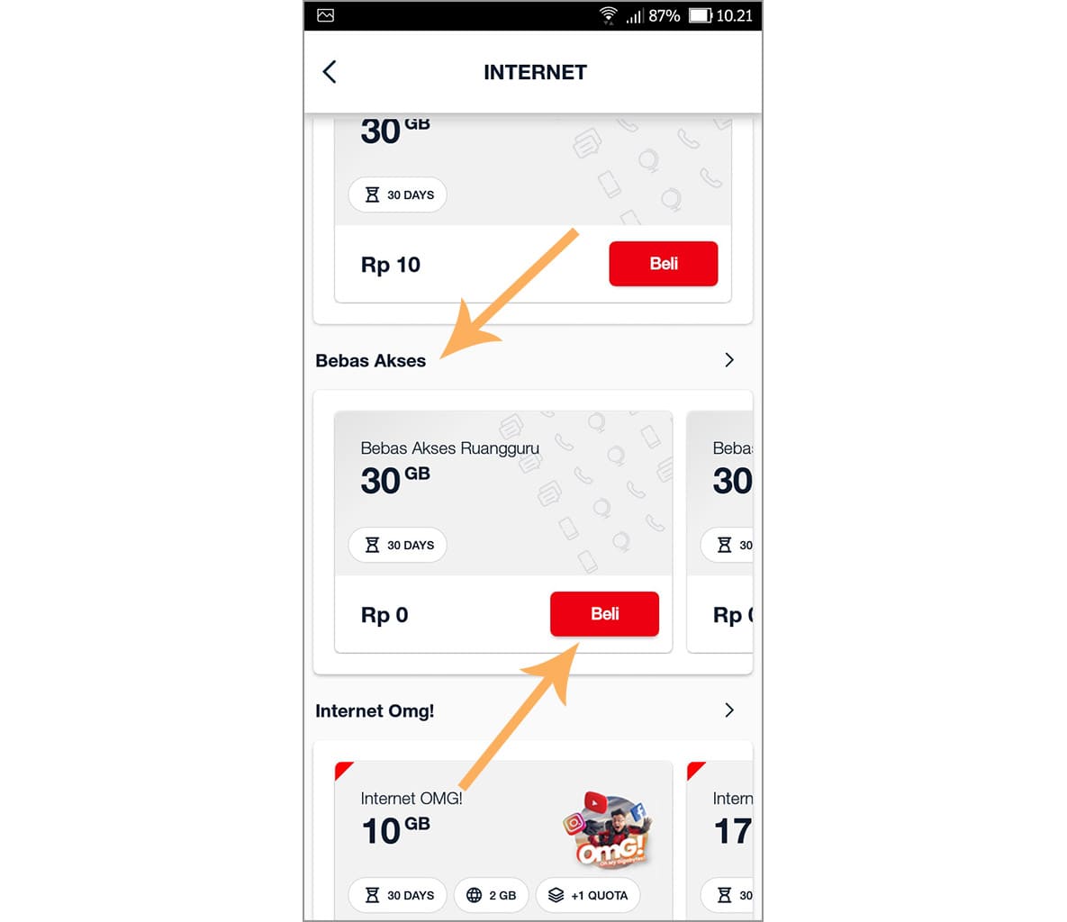 4. Pilih kategori bebas akses, kemudian ketuk beli pada bebas akses Ruangguru.