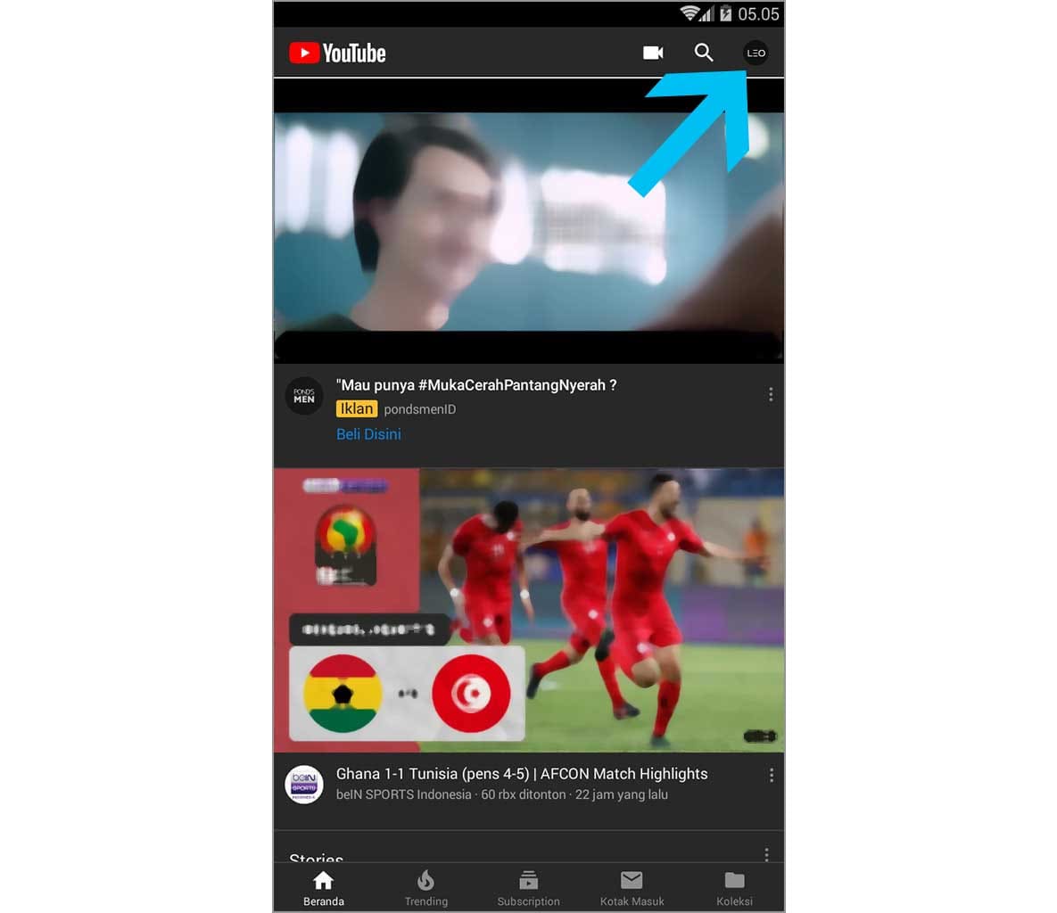 3. Adapun untuk mengetahui trending YouTube yang ada di negara lain lewat aplikasi, silakan ketuk foto profil yang terletak di pojok kanan atas.