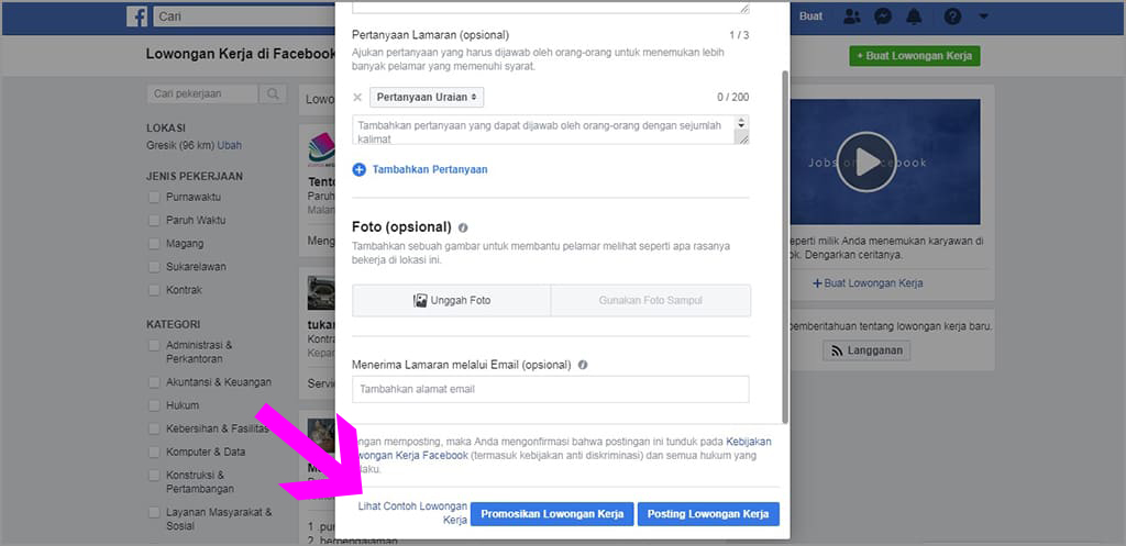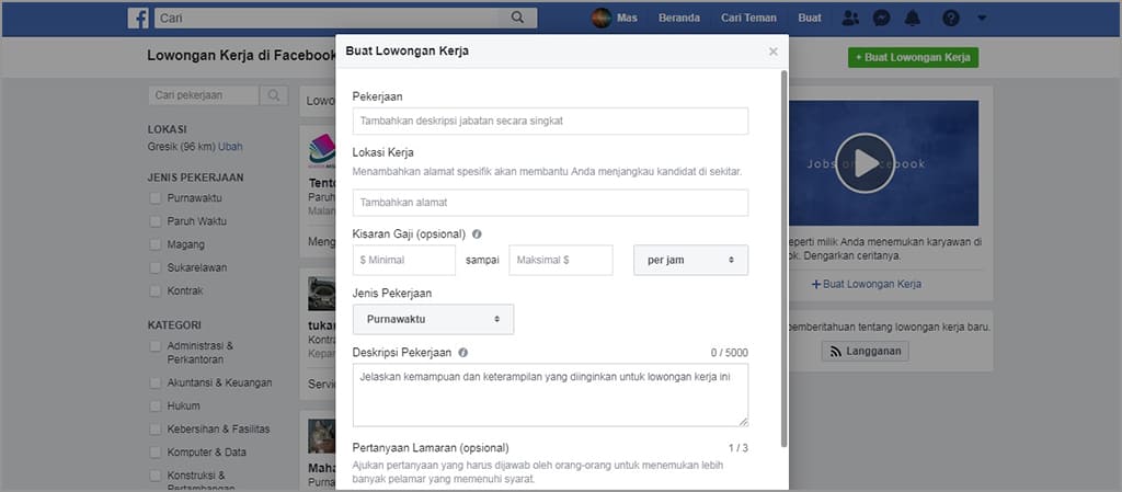 Adapun untuk jenis pekerjaan juga terdapat beberapa pilihan yang dimulai dari purnawaktu atau yang kita kenal dengan nama full time, paruh waktu, magang, sukarelawan, dan juga kontrak. Jadi ketika Anda sudah mencari pekerjaan di berbagai situs lowongan kerja dan belum mendapatkannya, maka Anda bisa mencari pekerjaan di Facebook Jobs.