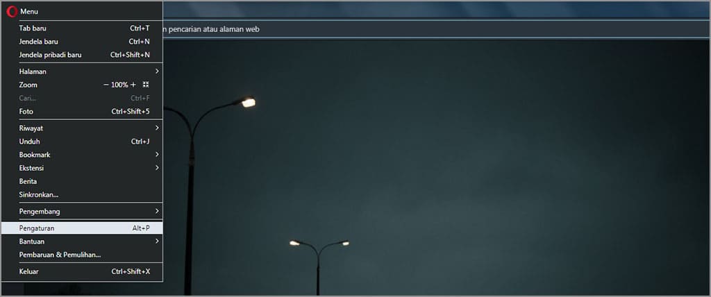 2. Klik logo Opera yang terletak di pojok kiri atas, kemudian pilih pengaturan.