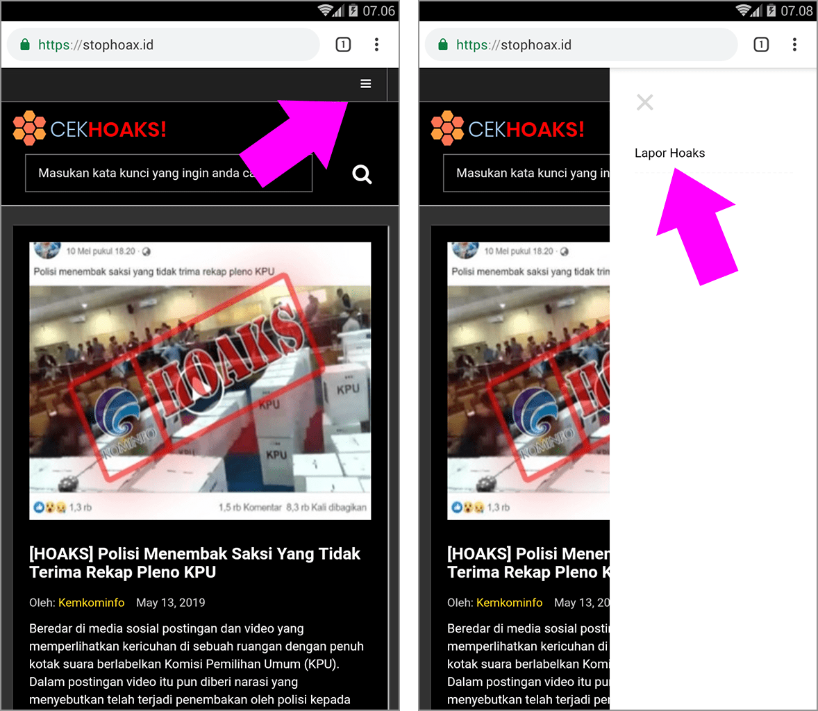 3. Anda juga bisa melaporkan hoaks dengan cara mengetuk tiga garis yang terletak di pojok kanan, kemudian pilih lapor hoaks.