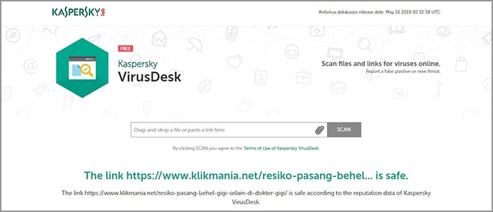 Tautan yang aman akan muncul keterangan safe seperti gambar di atas. Selain menempelkan URL, Anda juga bisa mengunggah sebuah file dengan cara klik ikon file yang terletak di sebelah kiri scan.