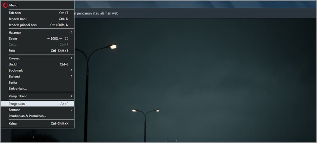 2. Klik logo Opera yang terletak di pojok kiri atas, kemudian pilih pengaturan.