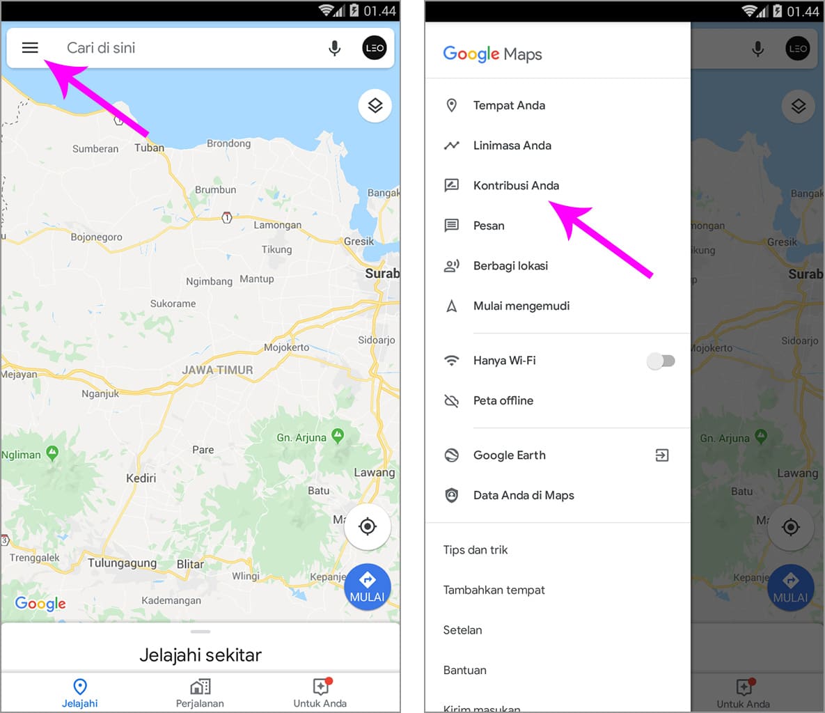 2. Jika sudah, silakan ketuk tiga garis horizontal yang terletak di pojok kiri atas, kemudian pilih kontribusi Anda.