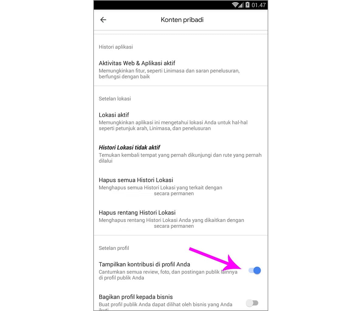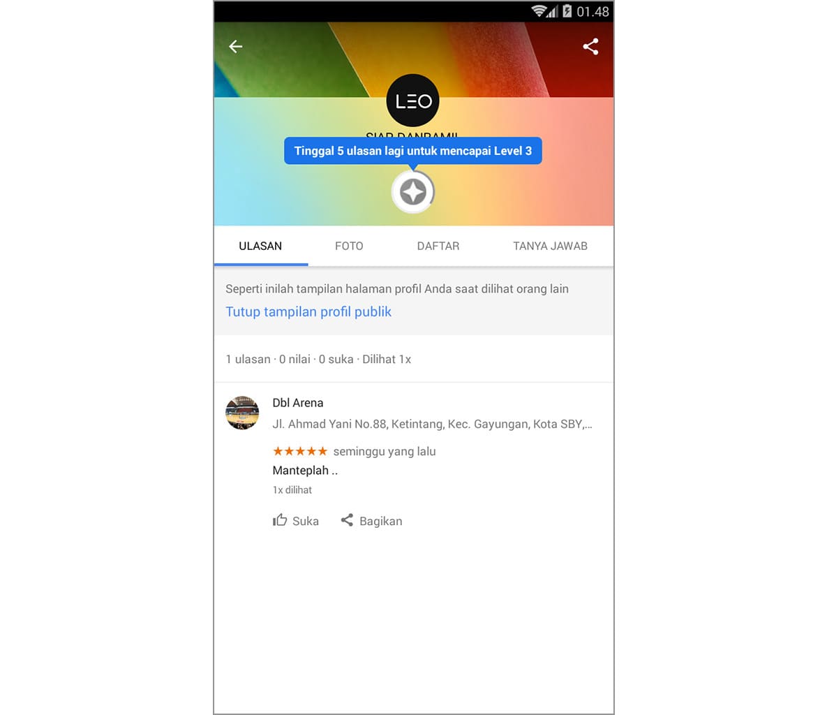 Cobalah berbenah dahulu karena tujuan awal dibuatnya Local Guide oleh Google adalah untuk memudahkan pengguna lain untuk menemukan informasi terkait tempat yang dituju. Baru setelah Anda berbenah atau yang lebih tepatnya memberikan ulasan yang benar-benar membantu, silakan Anda mengaktifkan tampilkan kontribusi di profil Anda.