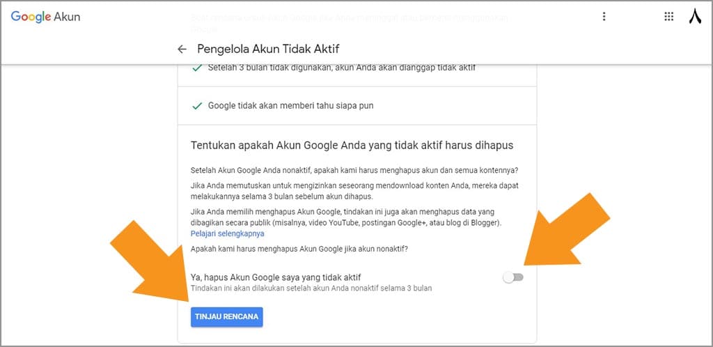 7. Aktifkan hapus akun Google dengan menggeser tombol ke kanan, kemudian klik tinjau rencana.