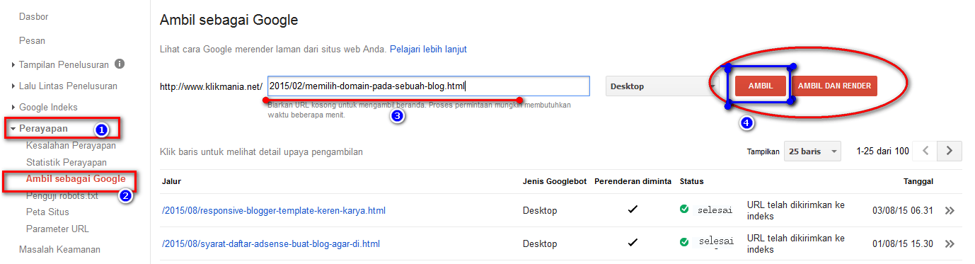 Fungsi Fetch As Google (Ambil sebagai Google) adalah membuat artikel baru terindex dengan cepat. Hal ini yang sangat penting dilakukan apabila kita baru menyelesaikan sebuah postingan, agar artikel langsung dimasukkan kedalam daftar pencarian google pada saat itu juga.