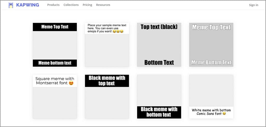 Kapwing memiliki semua yang Anda inginkan dari generator meme. Ada banyak template dengan format meme yang paling umum, seperti template dengan teks putih di bagian atas dan bawah. Berikut ini beberapa template yang bisa Anda gunakan di Kapwing.