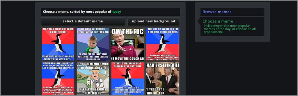 Silakan klik select a default meme atau upload new background untuk mulai membuat meme. Ketika meme sudah jadi, akan terdapat watermark kecil yang terletak di pojok kanan bawah. Keberadaan watermark sendiri tidak bisa dihilangkan meskipun Anda sudah login. Jika dibandingkan dengan Kapwing dan iLoveIMG, Imgur memang berada di bawahnya.