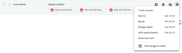 Email di atas, dicoba menggunakan fitur tunda. Saat masa percobaan, waktu menunjukkan pukul 08:00 WIB, dan saat itu, waktu penundaan yang dipilih adalah pukul 08:42 WIB.