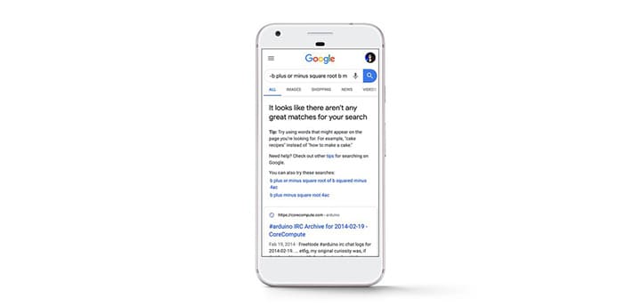 Kurang lebih seperti gambar di ataslah fitur baru yang disematkan oleh Google. Dengan fitur tersebut, ketika Anda melakukan pencarian dan tidak menemukan hasil yang tepat, maka pesan akan muncul di posisi paling atas.
