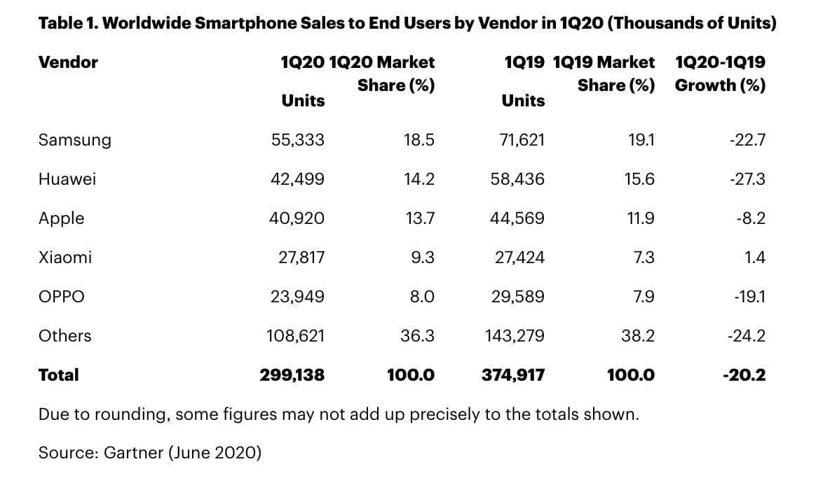 Secara umum, penjualan smartphone global mengalami penurunan. Samsung, yang menjadi merek nomor satu dunia pun juga mengalami penurunan di mana mereka mengalami penurunan sebesar 22,7 persen. Setelah Samsung, ada nama Huawei yang mengalami penurunan sebesar 27,3 persen.