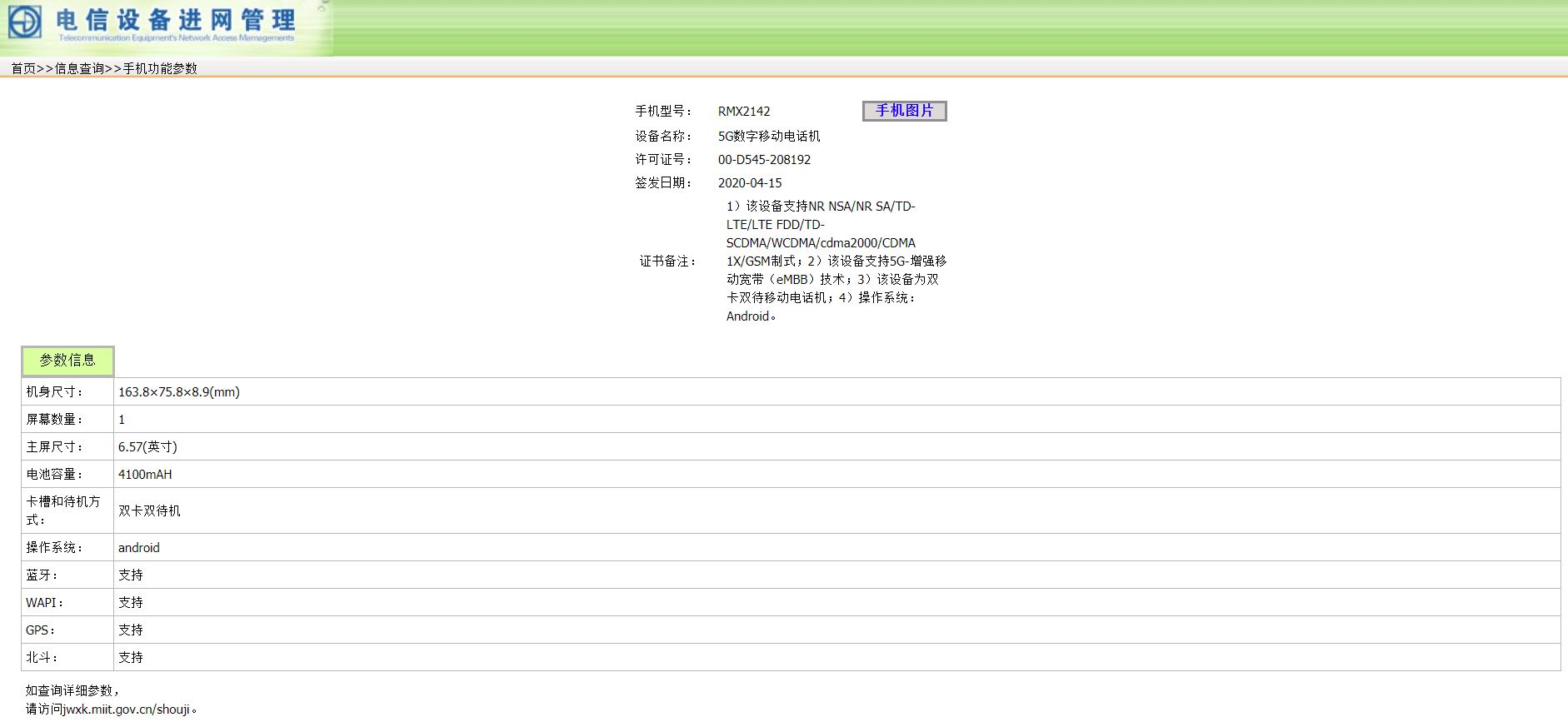 Smartphone tersebut mengusung model number Realme RMX2142 dan di-duga kuat sebagai vanilla Realme X3. Listings yang diberikan TENAA juga memperlihatkan sedikit info menyangkut spesifikasi smartpohne tersebut.