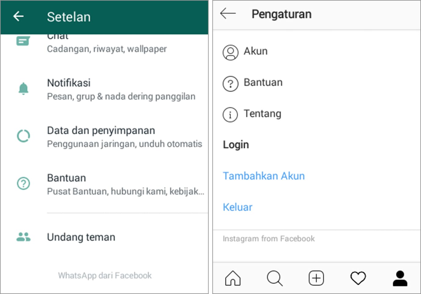 Untuk melihat embel-embel Facebook, Anda cukup lari ke pengaturan WhatsApp dan juga Instagram. Jika sudah masuk ke menu pengaturan kedua aplikasi tersebut, silakan gulir hingga ke bawah, maka keterangan “WhatsApp from Facebook” dan juga “Instagram from Facebook” sudah bisa Anda lihat.